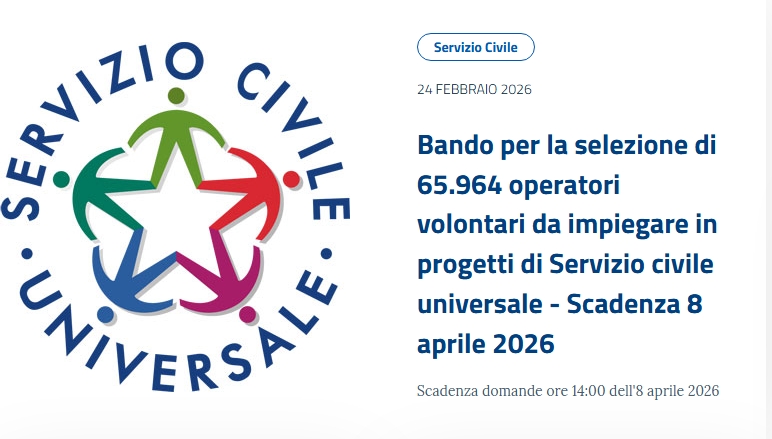 Bando Servizio Civile Universale https://www.politichegiovanili.gov.it/comunicazione/news/2026/2/bando-ordinario-2026/
